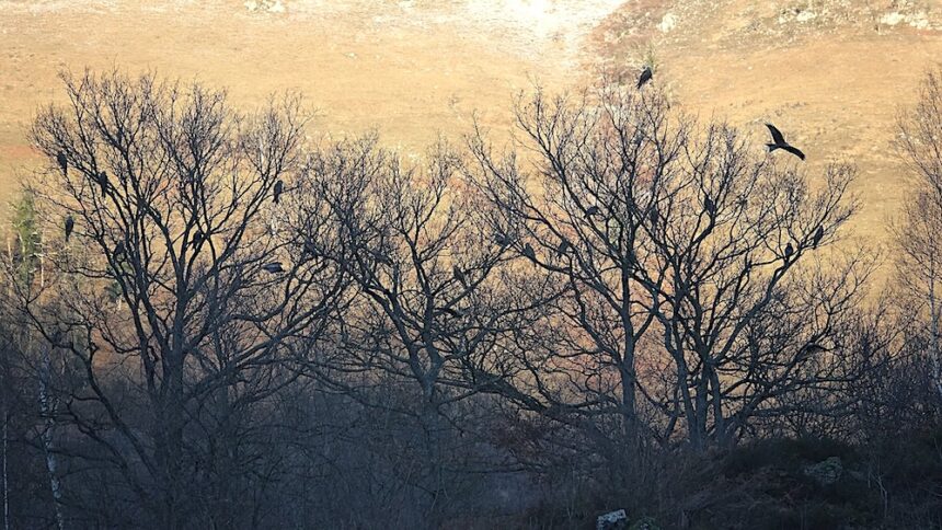 Avec l’arrivée des premiers froids, les milans royaux deviennent grégaires et se rassemblent au crépuscule dans des « dortoirs », parfois composés de plusieurs dizaines ou centaines d’individus, pour y passer la nuit.