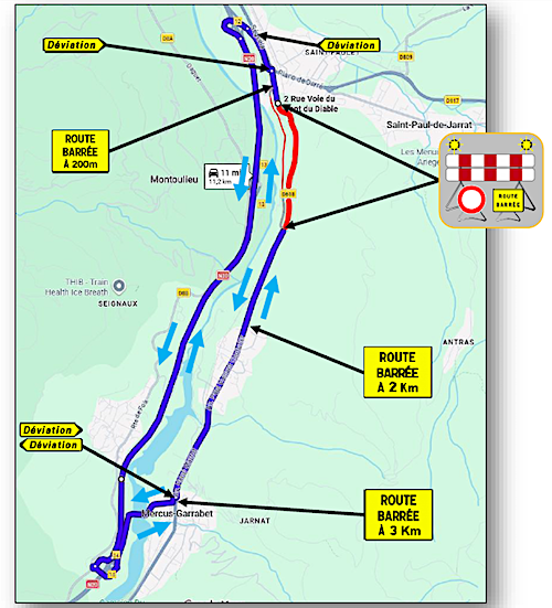 Une déviation sera mise en place via la RN 20, entre les échangeurs 12 (Saint-Paul-de-Jarrat) et 13 (Mercus), ainsi que par la D20A et la D618, conformément au plan de circulation établi par les services, ci-dessous :