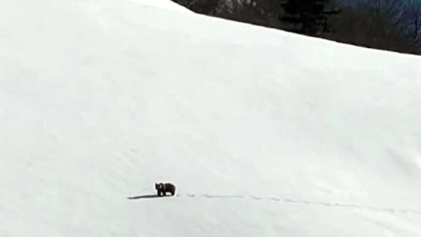 Samedi 4 avril, en fin d’après-midi, des randonneurs en raquettes qui terminaient leur balade sont restés sans voix devant un ours brun profitant du soleil sur les pistes de la station de Guzet.
